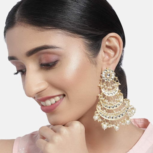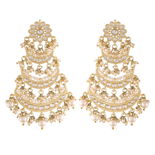 Jewels 18k Gold Plated 3 Layered Beaded Chandbali Earrings with Kundan and Pearl Work for Women
