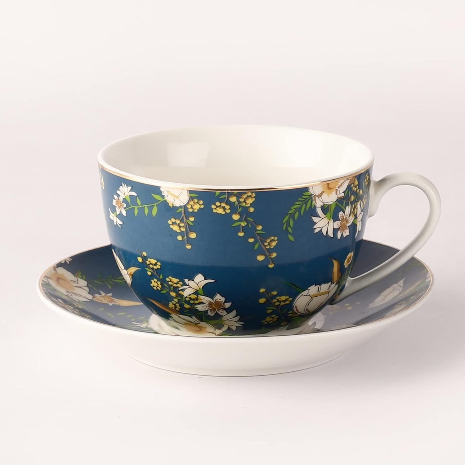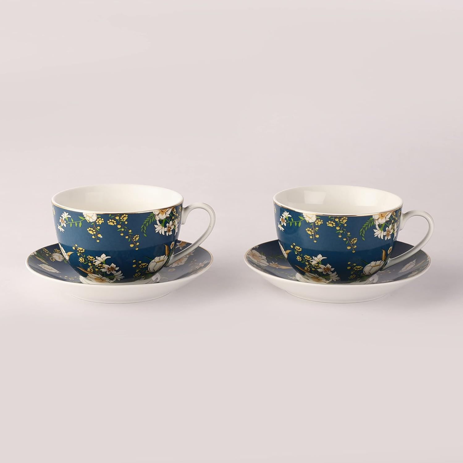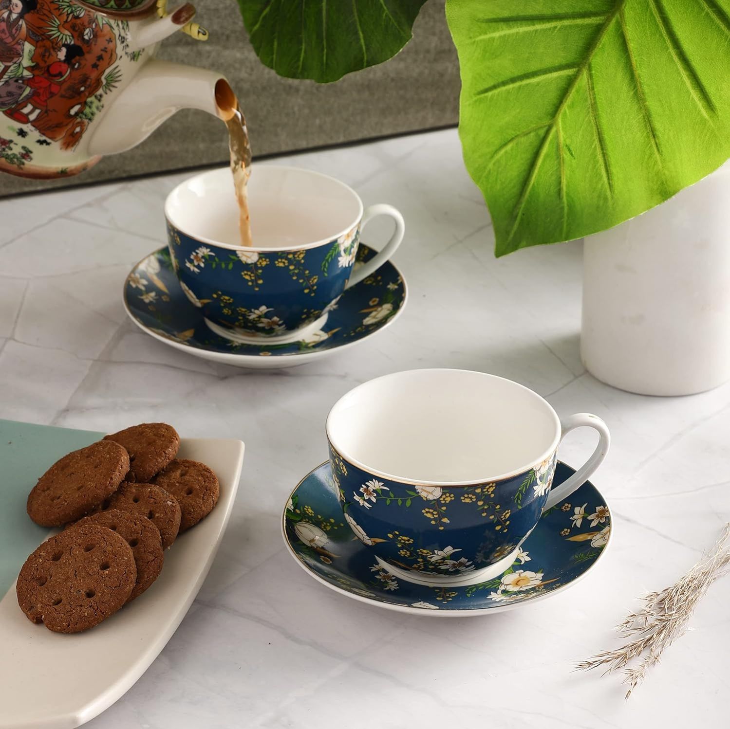 The Decor Mart 'Teal' Hand-Engraved Ceramic Tea Cups Set & Saucers (Set of 2, 300 ML, Microwave Safe, Dishwasher Safe) - Ceramic Cup Plate Set for Tea Ceramic Cup and Saucers Sets Tea Set